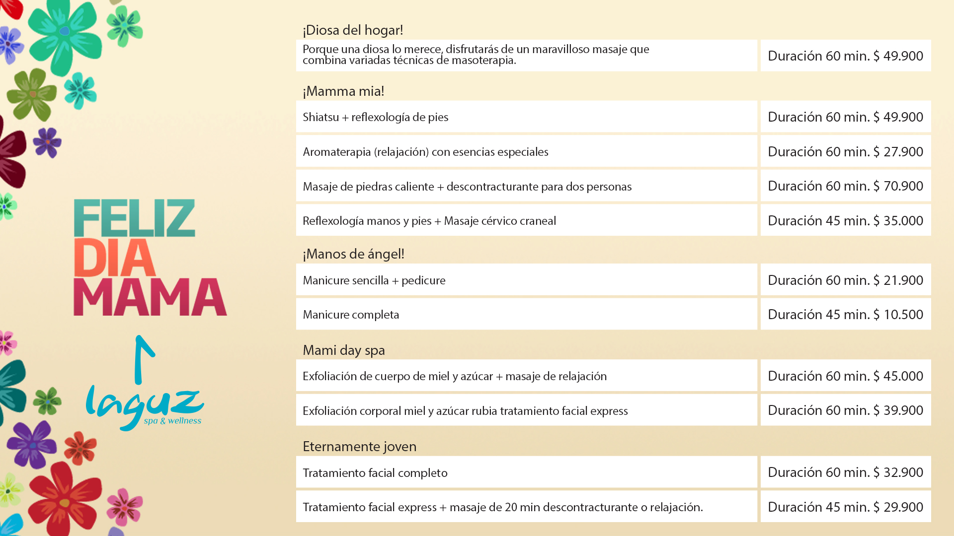 Rosa Agustina Resorts & Spa te invita a regalonear a tu Mamá con el mejor regalo en su día, presentes, sorpresas y atención de excelencia es lo que te ofrecemos para celebrar su día junto a nosotros. Hemos preparado un variado programa de actividades para que sorprendas a la persona más importante de tu vida, disfrutando el fin de semana junto a nosotros o el Día de la Madre con almuerzo y once especialmente para ellas.