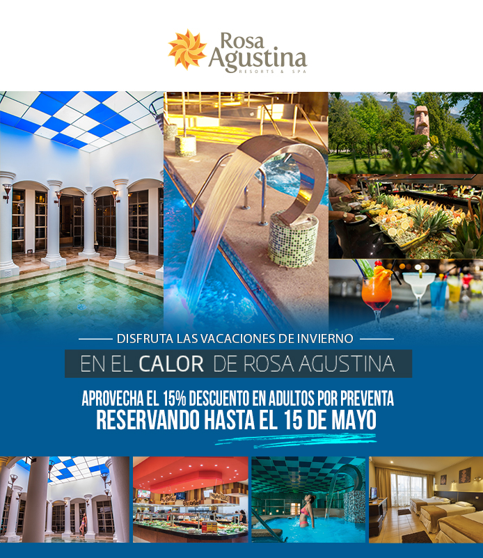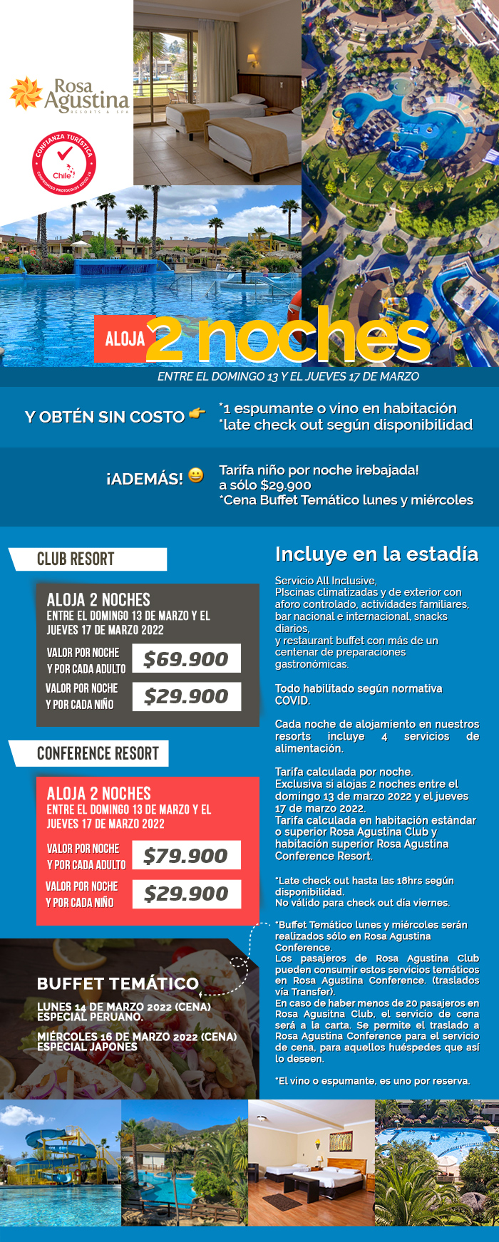 TARIFA NIÑO A SOLO $29.900 POR NOCHE EN AMBOS RESORTSLATE CHECK OUT HASTA LA18HRS SEGÚN DISPONIBILIDAD Y NO VÁLIDO LOS DÍAS VIERNES.1 ESPUMANTE O VINO POR RESERVA.PERMITE QUE PASAJEROS DE CLUB PUEDAN UTILIZAR INSTALACIONES DE CONFERENCEBUFFET TEMÁTICO LOS DÍAS LUNES Y MIÉRCOLES EN ROSA AGUSTINA CONFERENCE. LOS PASAJEROS DE ROSA AGUSTINA CLUB PUEDEN CONSUMIR ESTOS SERVICIOS TEMÁTICOS EN ROSA AGUSTINA CONFERENCE CON TRASLADOS VÍA TRANSFER.EN CASO DE HABER MENOS DE 20 PASAJEROS EN ROSA AGUSTINA CLUB, EL SERVICIO DE CENA SERÁ A LA CARTA. SE PERMITE EL TRASLADO A ROSA AGUSTINA CONFERENCE PARA EL SERVICIO DE CENA PARA AQUELLOS PASAJEROS QUE ASI LO DESEEN.