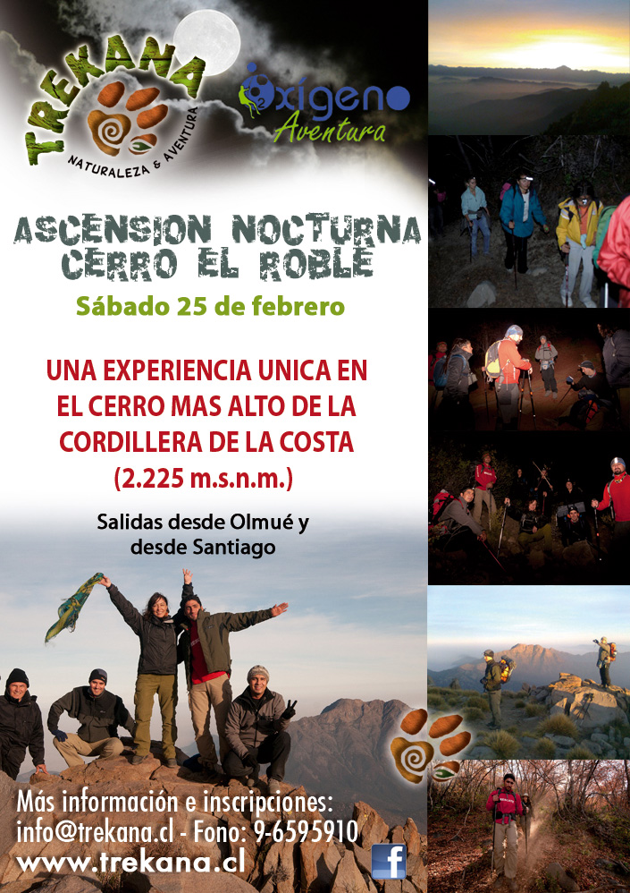 Se inicia la actividad en Olmué, en donde se realizará una breve instrucción técnica por parte de los guías de montaña y desde donde partiremos en vehículo hasta los pies del cerro El Roble en el poblado de Caleu (800m.s.n.d.m aprox.). El traslado dura alrededor de 30 minutos. La caminata se inicia por hermosos senderos abiertos, de forma tranquila y con paradas periódicas para hidratación y descanso, las que serán definidas por los guías según el ritmo físico del grupo. Los guías aprovecharán estas paradas para enseñar y generar experiencias a los clientes, a modo de ejemplo, se desarrollan actividades sobre técnicas de orientación, uso adecuado de ropa outdoors, visión y descripción de estrellas, interpretación y descripción de la flora y fauna nativa, técnicas básicas de fotografía, rescate de montaña entre otras materias.