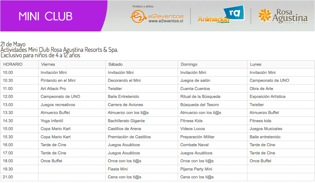 Diviértase con las sorpresas que tendremos junto a nuestro equipo de animación e2eventos. Grandes actividades para grandes y pequeños tales como: Búsqueda del Tesoro, Bailes entretenidos, Acuafitness en nuestras piscinas temperadas y talleres diseñados para toda la familia entre otros…